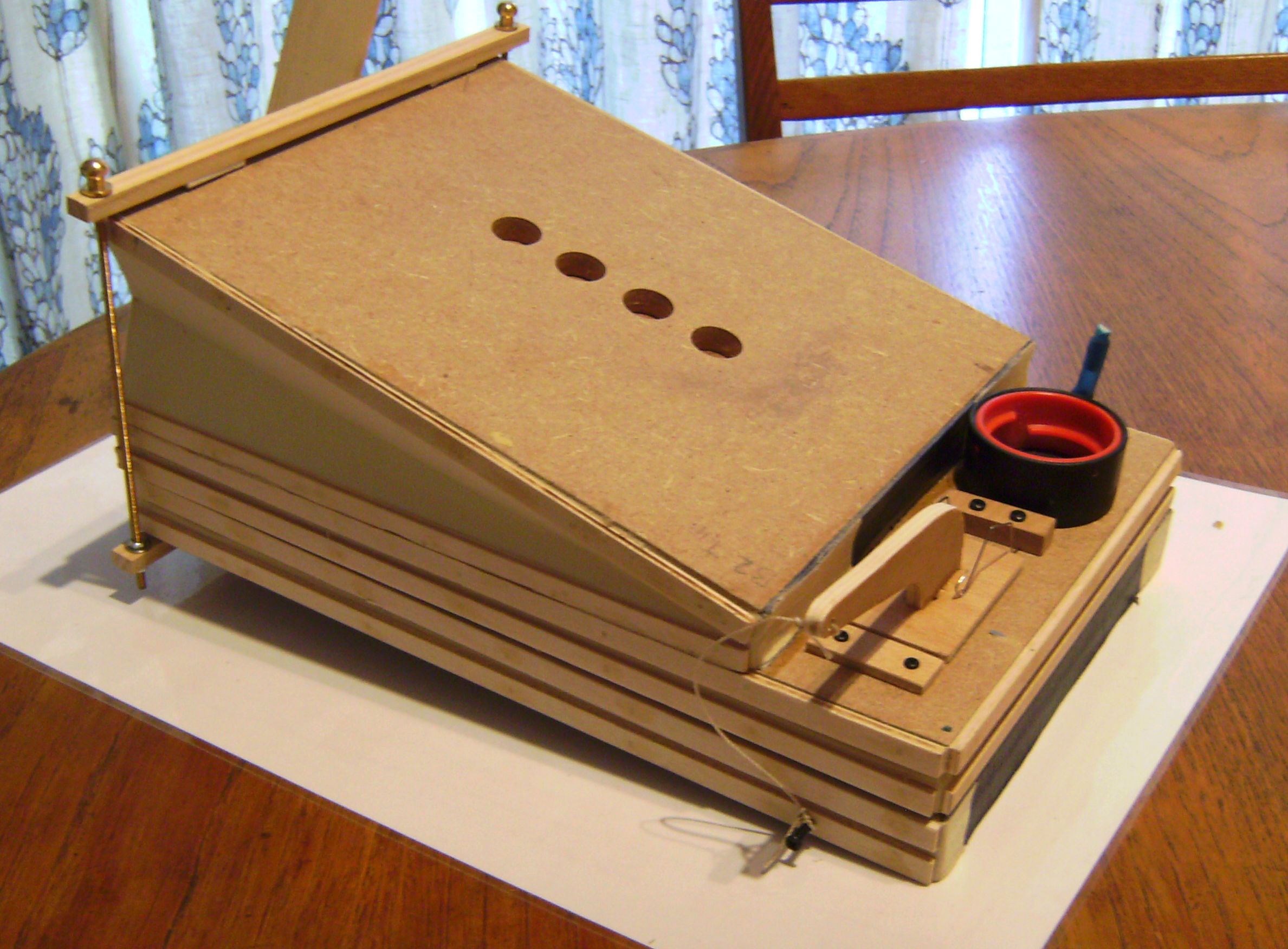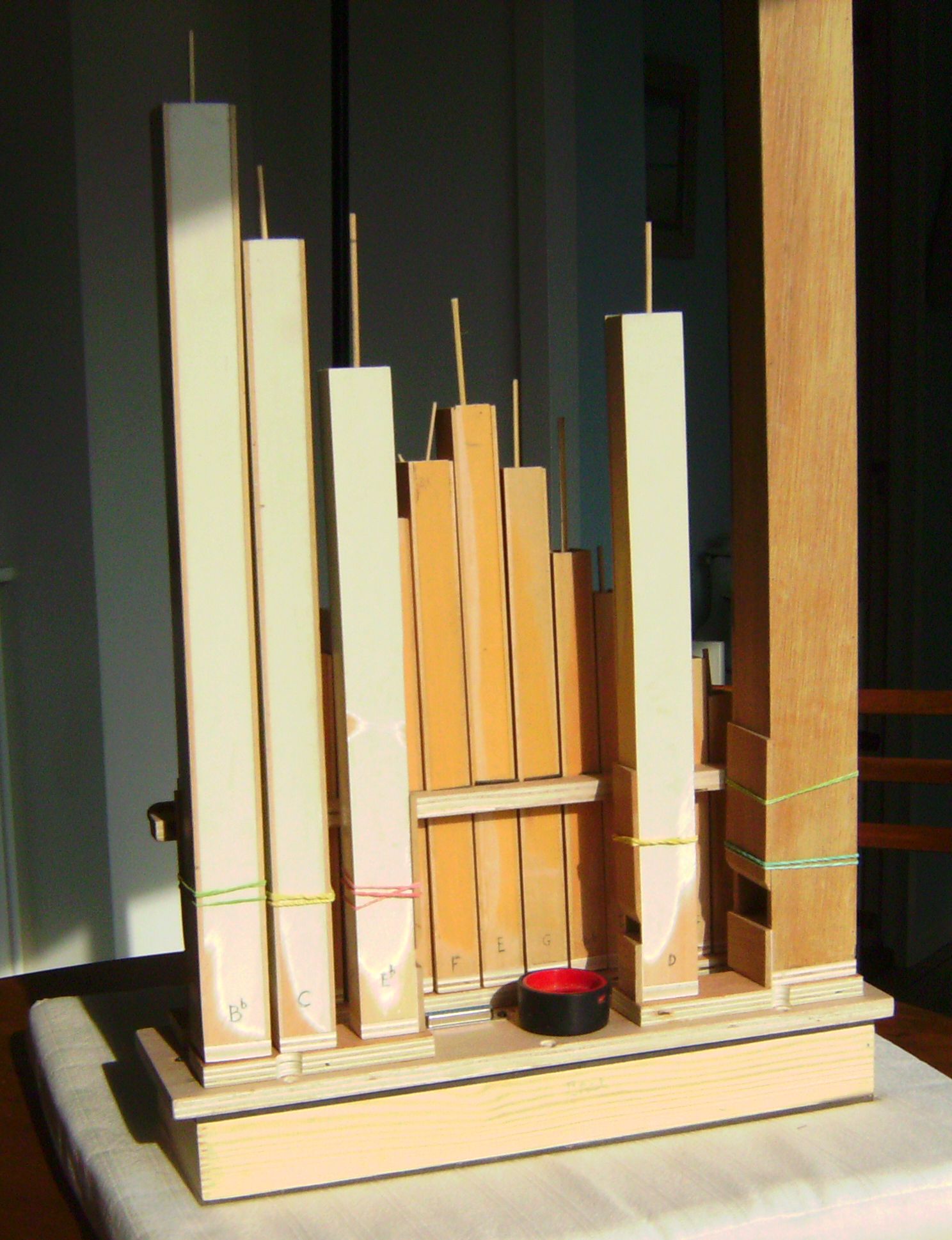 The front of the final case, showing the finials - made from gold-painted tops of old-fashioned 'dolly' clothes pegs - fitted on pipes whose tops are visible