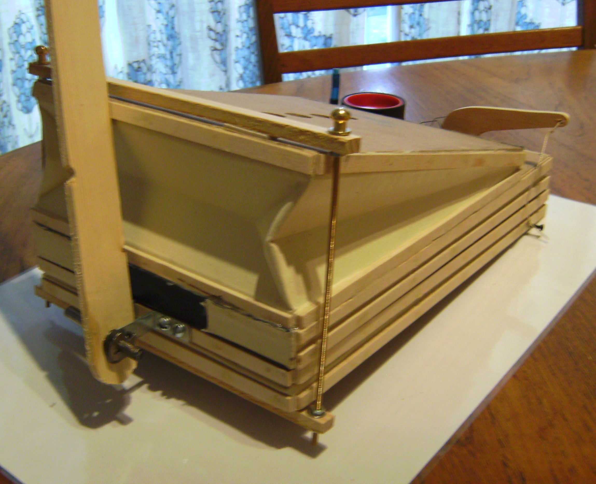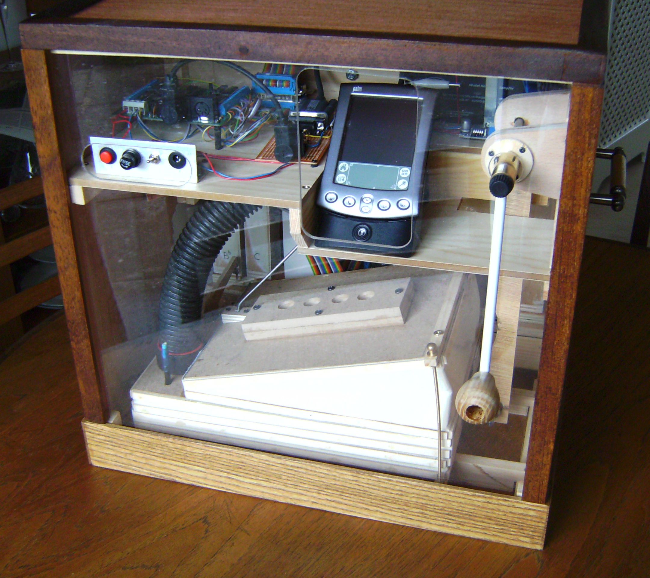 The back of the case, showing the winder for operating the bellows and the 'electronics' shelf with a trial arrangement of components