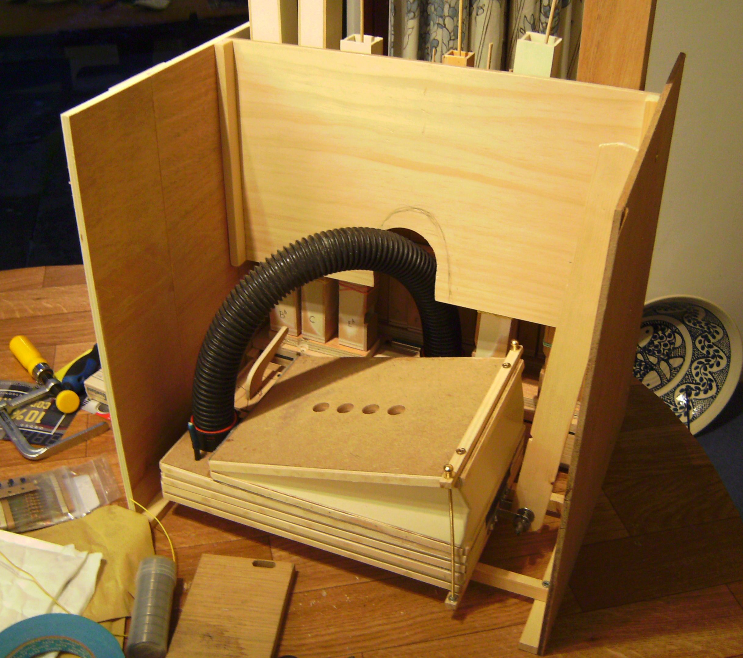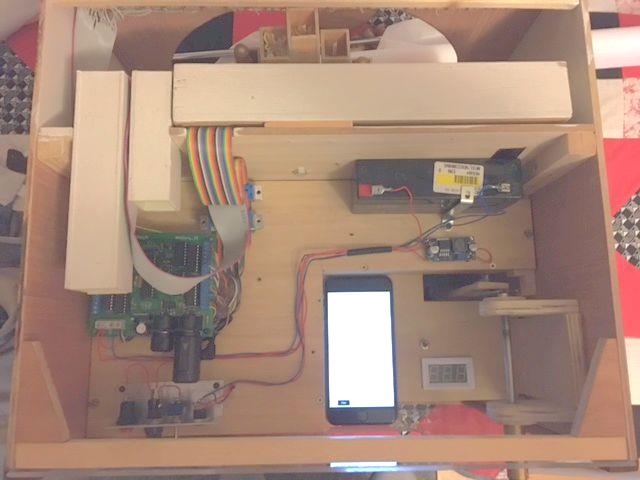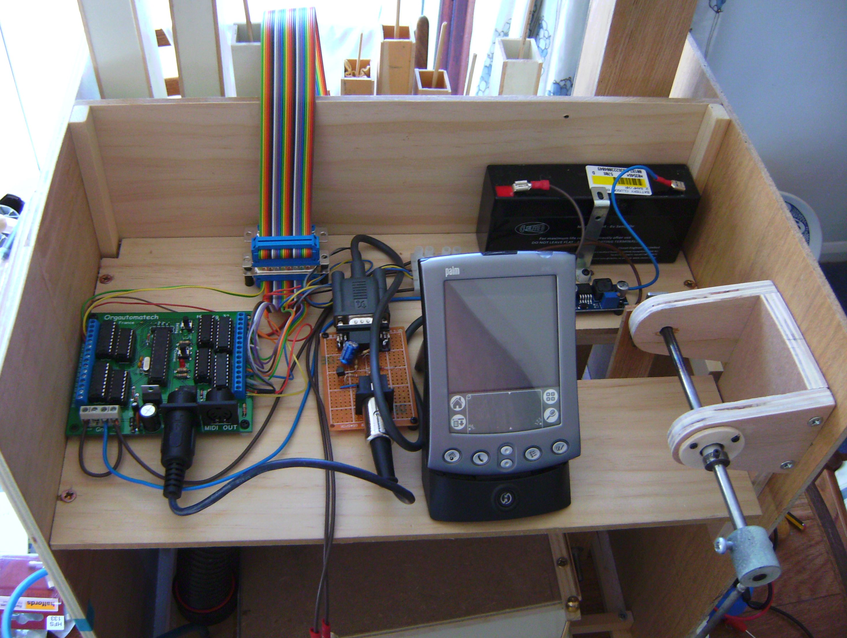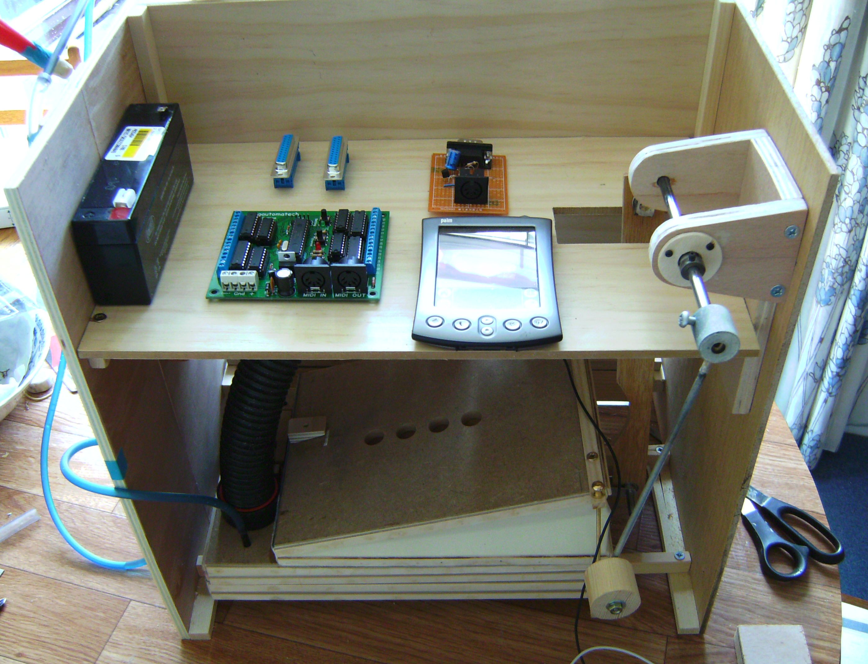 Latest view of the organ interior with the lid off, showing the iPhone ready to be taken out and used to control playing of MIDI files - instead of the Palm used previously