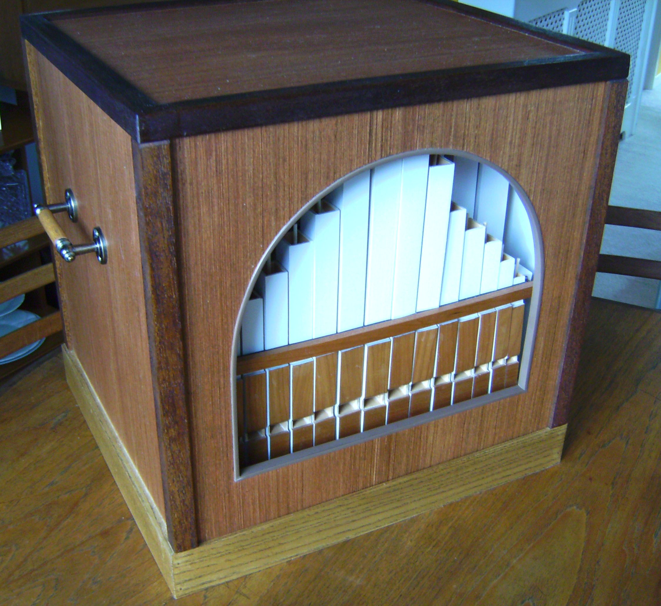 If you click here, you can see and hear the organ playing, with the addition of COLOUR! An alternative front is fitted to the case