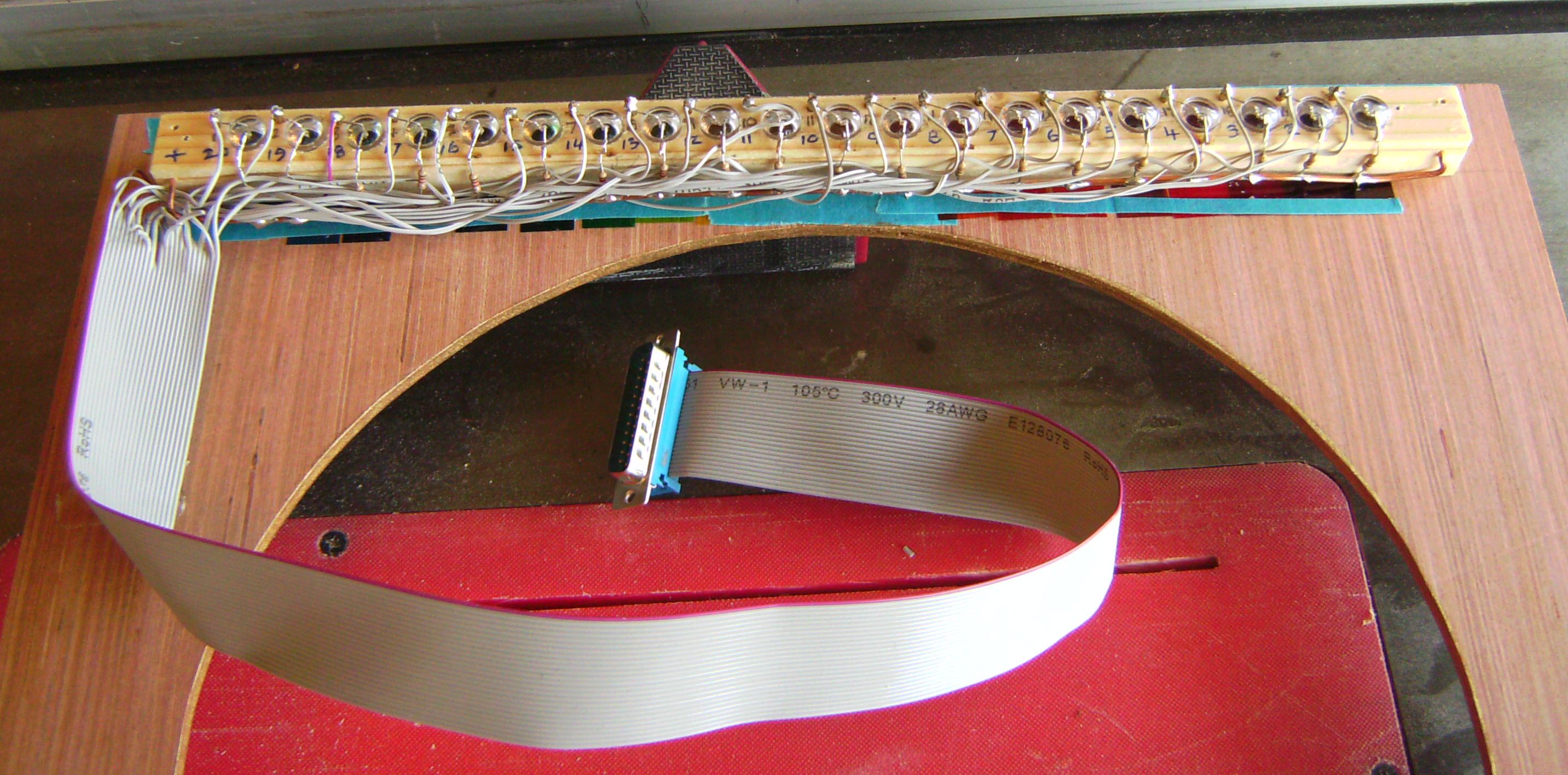 Wiring of the LEDs for the colour display. This was done twice as the first time I forgot that the wires to the connections on an IDC cable for a 25-way D Type connector do not go to Pins 1, 2, 3 4, 5 etc., but to 1, 14, 2, 15, 3, etc. So the long, fiddly job had to be completely redone - the second time I had it plugged in so that I could test each connection as it was made.