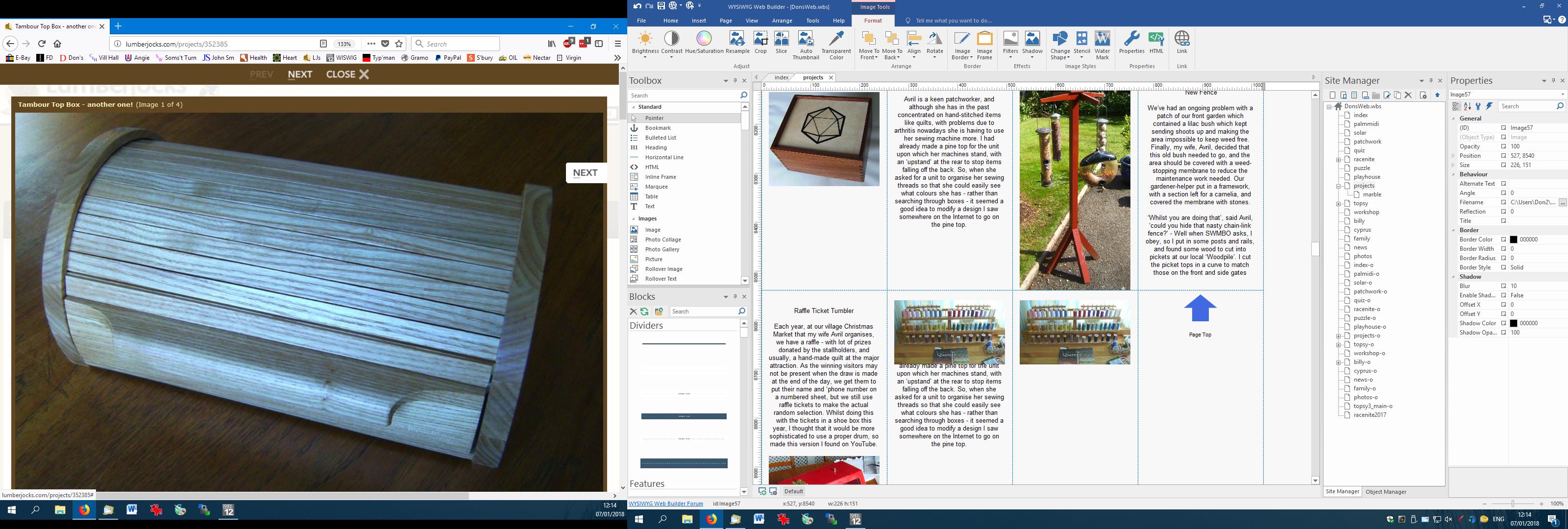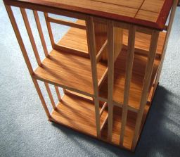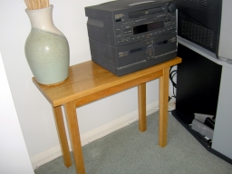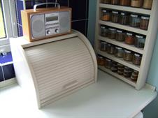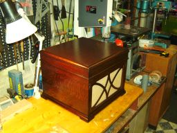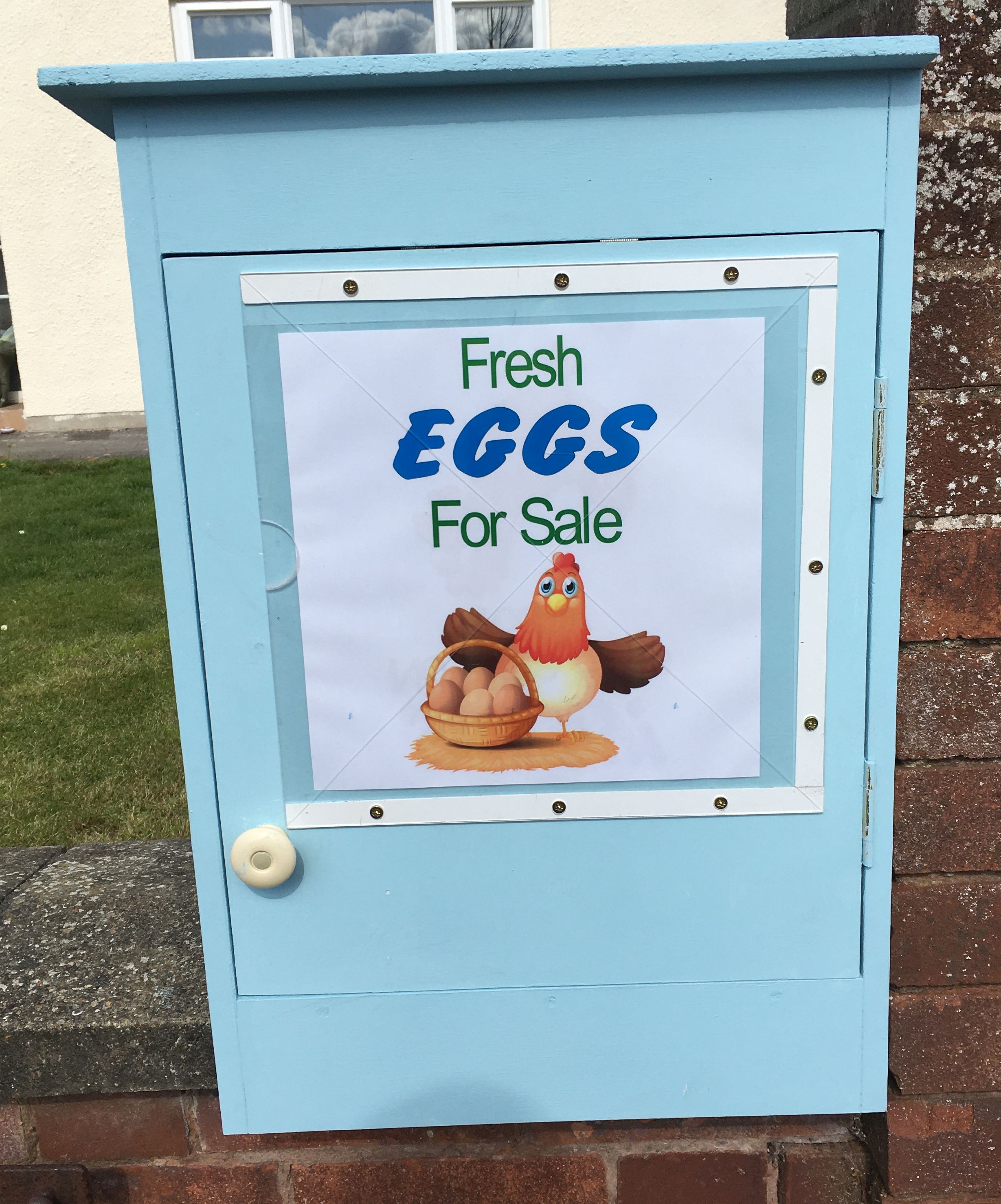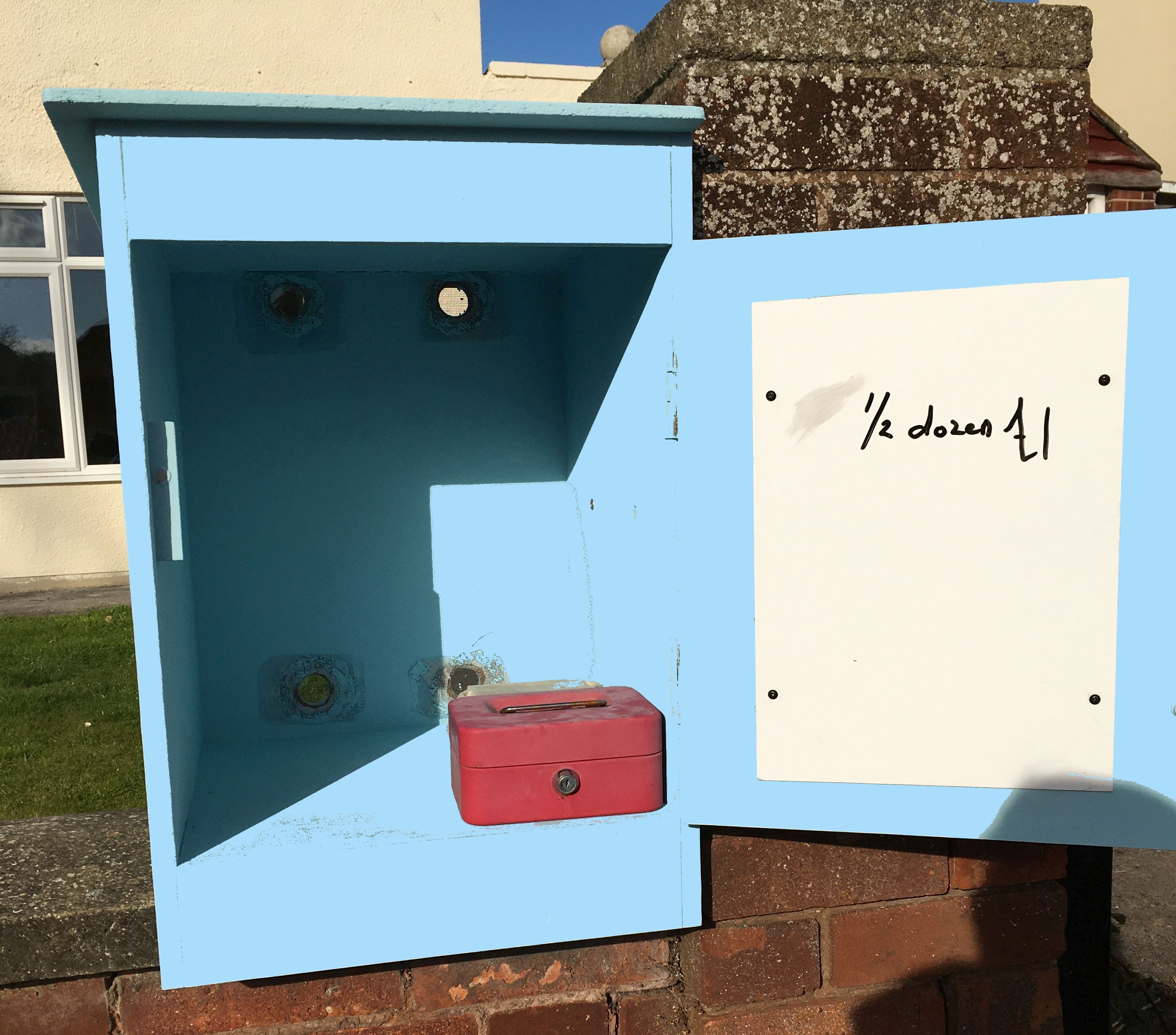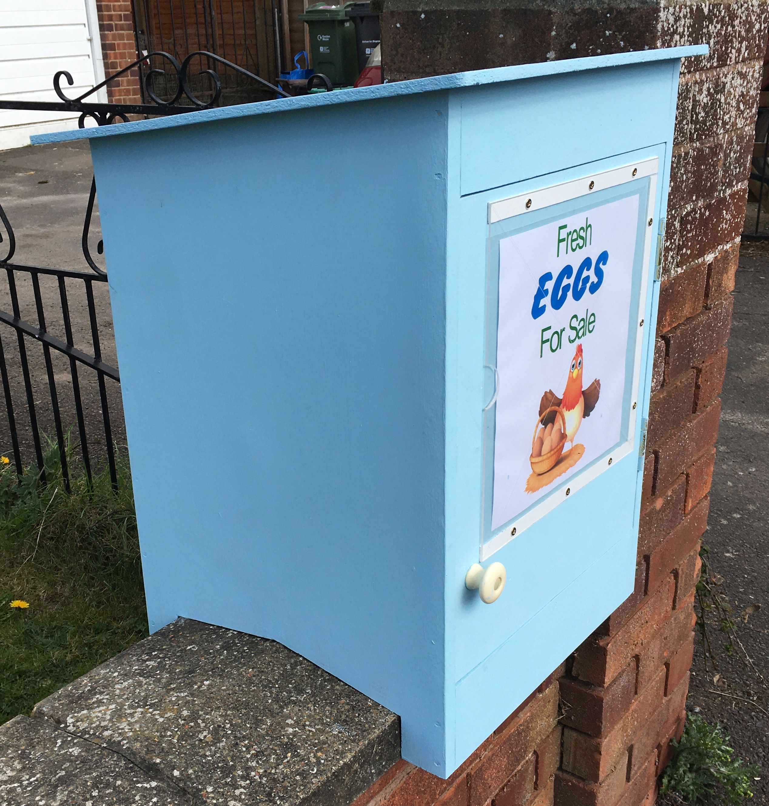 My neighbour keeps chickens and wanted to sell her surplus eggs in our village, so I made her a box out of an old computer desk she was throwing out and some white melamine board I had spare. Originally I was going to give it legs to raise it to a convenient height for purchasers, but then cut the extended box sides so that it could mount over the coping stones on her front garden wall (pic 2). I cut some holes in the back, at the top and bottom to allow air to circulate to prevent the eggs frying in hot sun, but covered them with mesh to keep bugs out, and an odd piece of whiteboard on the inside of the door can be used to show prices. (pic 4). A concrete screw into the adjacent wall column keeps the box securely fixed.