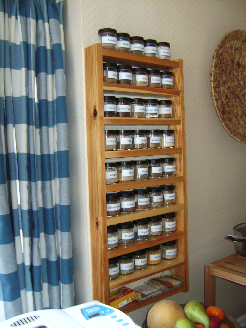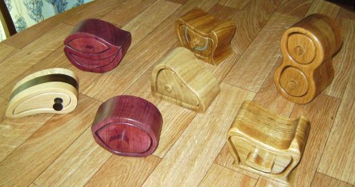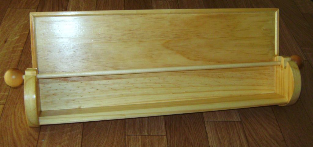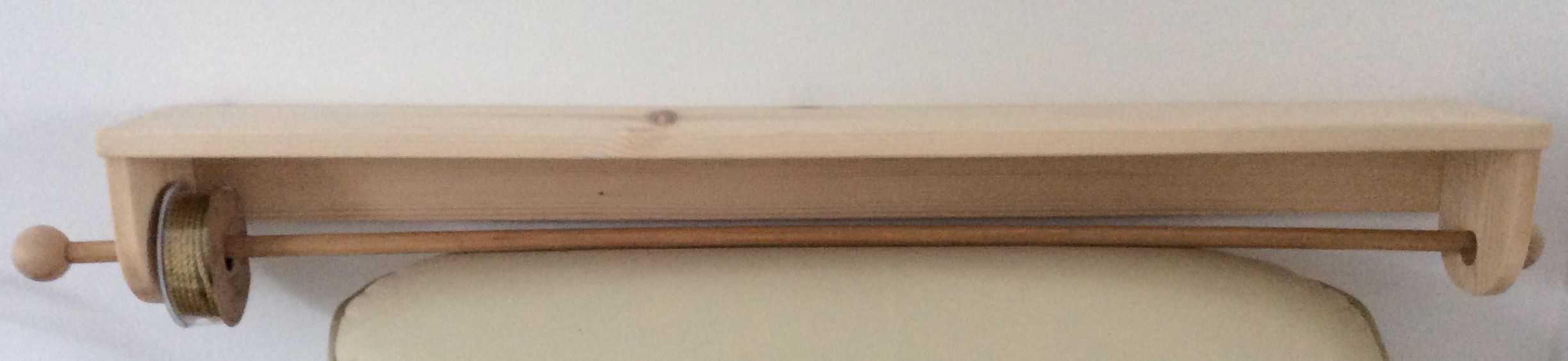 I was asked to make a rack for ribbon reels, and provided with a page from a magazine illustrating one made from a Boston Shelf sold by Dunelm. The shelf seemed to be no longer available, so I used some cleaned-up offcuts of pine and simply glued and air-nailed them together.. The only part that had me scratching my head was how to fix the knobs on the ends of the support dowel. Initially I used a screw through the knob, but that meant the user needed a screwdriver each time reels were changed. I then thought of cutting screw threads on the dowel and into a recess in the knob, but the metal-working dies I have did not work on the wooden dowel. Finally, I came to the modern standby for this sort of thing, rare earth magnets - one araldited onto the end of the dowel, and another in a recess on the knob. I included one of the plastic spacers supplied with the magnets in the recess to reduce the strain on the araldite when removing the knob.