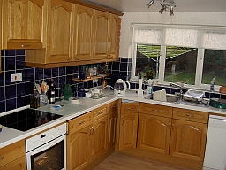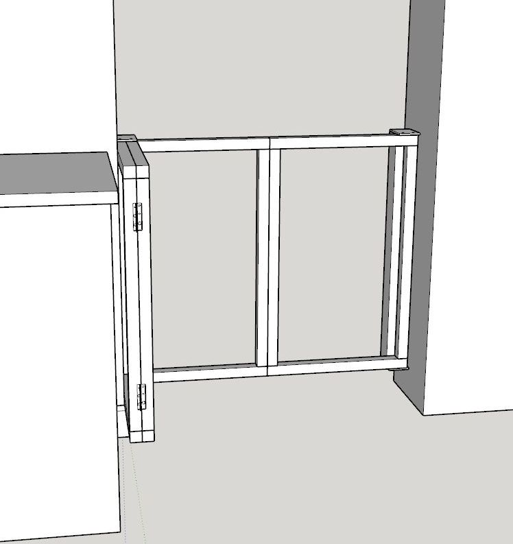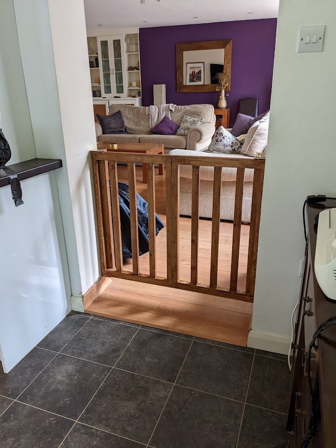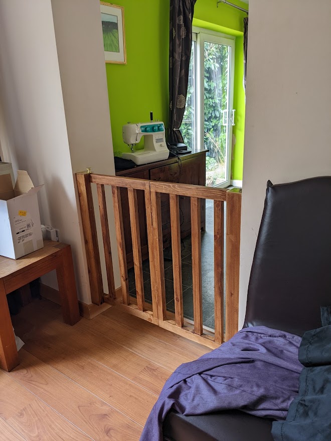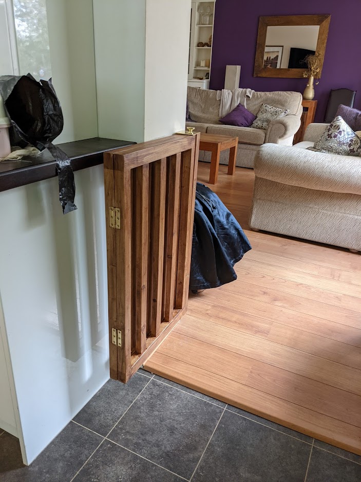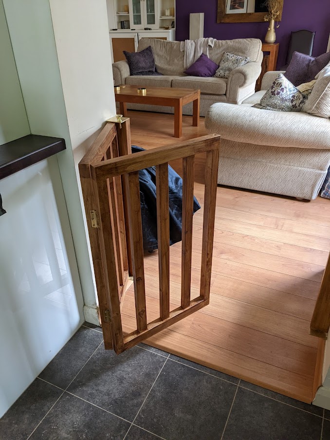 My son needed some way to keep his dogs in the kitchen/diner area overnight - away from their new suites in the lounge. He asked me if I could design and make something suitable. I eventually came up with a design which he liked, and that and the finished version are shown alongside. A pin attached to the brass knob in the second picture holds the folded gate open. It is moved to the top of the other support to keep the unfolded gate closed in the fourth and fifth pics.