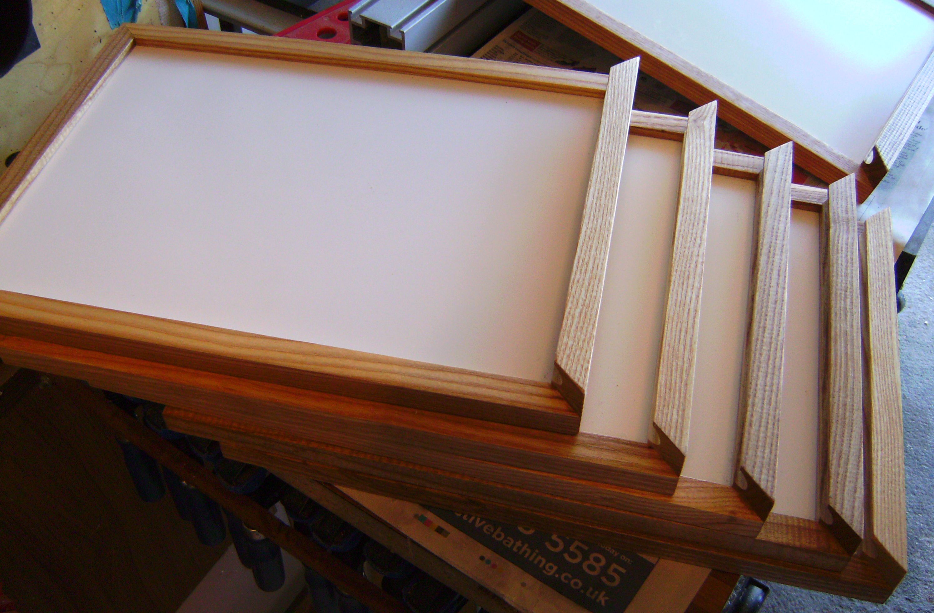 A friend asked me to make her a kitchen memo board, and I recalled that when our village hall was extended, the builders used a plastic material to line the walls of the kitchen, as it was washable and thus very hygienic. There had been some off-cuts left over and they worked very well with wipe-off markers. The bottom frame section has a groove for the marker.